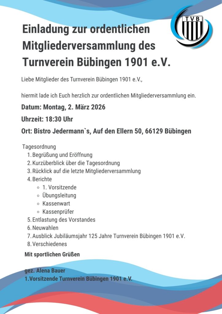 Die Versammlung ist ein wichtiger Moment, um gemeinsam auf das vergangene Jahr zu blicken, Weichen für dieses besondere Jahr im Turnverein zu stellen und eure Ideen, Wünsche und Stimmen einzubringen. Jede Teilnahme stärkt unseren Verein – und nur gemeinsam können wir weiterhin so lebendig, engagiert und erfolgreich bleiben.